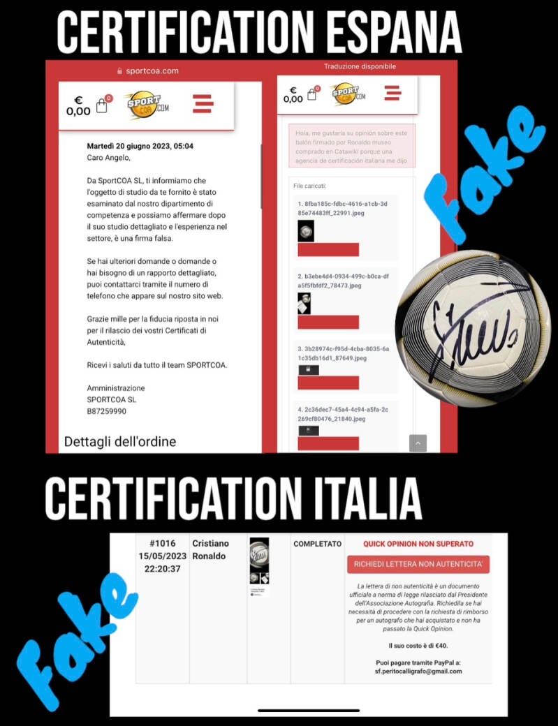 QUI SOTTO METTO DUE GIUDIZI DI ENTI DI CERTIFICAZIONE CON PERITI CALLIGRAFI CHE IN BAFFO AL MUSEO E AL PARERE degli "esperti ?" di Catawiki dichiarano che il pallone come molti moltissimi altri provenienti dal museo sono FAKE !!! ho anche altre conferme che altri enti come PSA JSA ecc. NON CERTIFICANO QUESTI OGGETTI DEL MUSEUM .